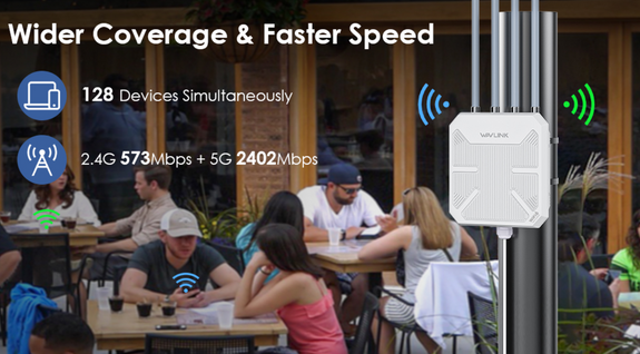 - 【Enjoy True WiFi 6 Speed】The next generation of WiFi, complies with IEEE 802.11 ac/a/b/g/n standards. Supports dual-band maximum speed up to 5GHz 2402Mbps and 2.4GHz 573Mbps, avoiding wireless interference & congestion and offering lightning-fast Internet speed. With WAVLINK WN573HX3, you can enjoy HD videos, smooth gaming, etc. even outdoors.