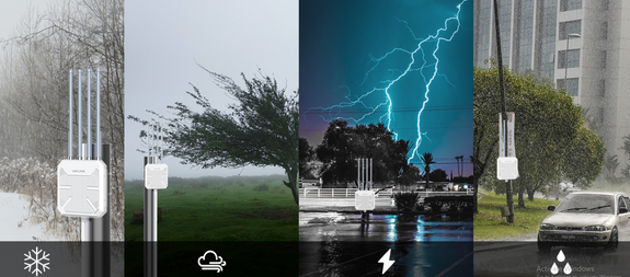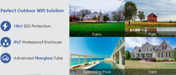 - 【Designed for Harsh Outdoor Conditions】Equipped with IP67 waterproof enclosure, 15kV ESD protection and 6kV lightning protection, it can work normally in rain/snow/wind/thunder and other bad weather. The fiberglass tube high-gain antennas can not only withstand strong wind and corrosion, but also boost the WiFi coverage, making it more suitable for outdoor use.